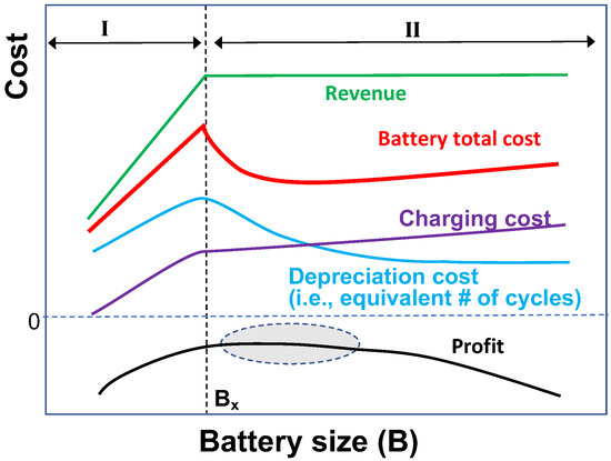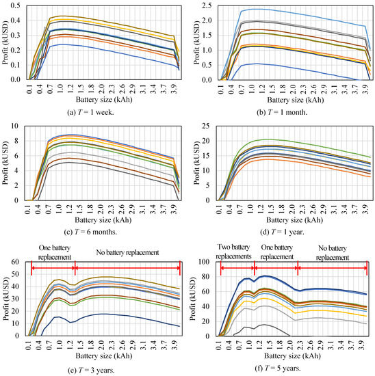 As we increased T to values that might result in wearing out of the battery (typically after 2–3 years, corresponding to approximately 1000 charge cycles), the shape of the profit curve changed. Depending on the battery size, one or more replacements might be needed. When years, as shown in Figure 8e, the battery needed to be replaced if its size was smaller than 1.2 kAh. If we increased T to five years (Figure 8f), two replacements were needed for sizes smaller than 1.1 kAh and one replacement for size smaller than 2.3 kAh. These events resulted in dips in the profit curves, which were more evident when a larger battery was replaced, and that caused the presence of local minima and maxima.