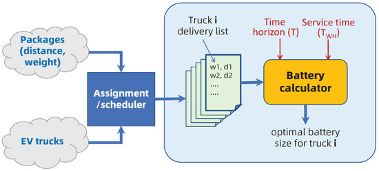 Our cost-optimal battery size calculator (shown in the rounded rectangle in figure) took therefore a list of delivery tasks (weight and distance from a depot) and considered each truck independently of the others. Notice that the tool took two parameters: the overall time horizon of the analysis T and the number of daily working hours , which were essential to perform the economical assessment that determined the battery size. It was therefore assumed that, for each truck, a list of deliveries long enough to cover T was available from the scheduler.