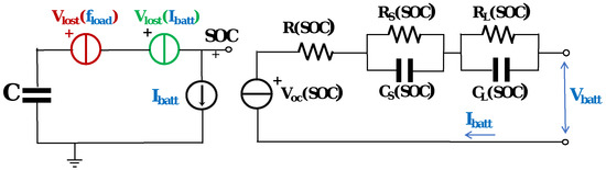 On the right-hand side, a voltage-controlled voltage generator expressed the non-linear dependence of battery open-circuit voltage (SOC). The RC network modeled the battery impedance, by exposing a series resistance R(SOC) that modeled the internal resistance and two RC blocks tracking the short-term (, ) and long-term (, ) time constants of a step response.