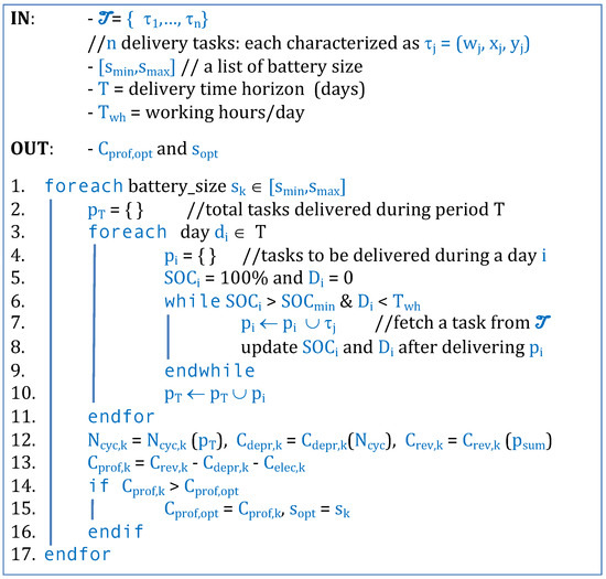 The objective of this algorithm is to estimate the profits of the delivery business by battery size; this is achieved by simulating the whole delivery schedule for different battery sizes within a given range . For each battery size (Line 1), the total set of delivered tasks over T is calculated by accruing the deliveries completed in each day . The truck departs from the depot and returns to the depot after delivering as many packages as possible as allowed by the given battery capacity and working hour of a day (Lines 6 to 9). A delivery task can be accomplished as long as the battery SOC and the total daily driving time . As soon as one of these two conditions does not hold, the daily delivery is considered as over, and we start processing the next day. Notice that Line 5 is reset to 100% (i.e., the battery is re-charged by the start time of the next day) and to 0.
