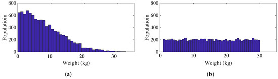 - a set of package weights, according to two distributions in the [0,30 kg] range: uniform and half-normal, in order to account for the case in which the majority of deliveries consisted of light packages and heavy ones were the exception. Figure 5a,b shows the two weight distributions used.