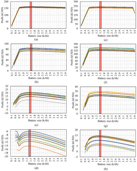 The average profit gain with respect to using the maximum battery size ranged from 3% up to 56% depending on the scenario. The minimum gain was obtained from Figure 6a and the maximum gain from Figure 6h.