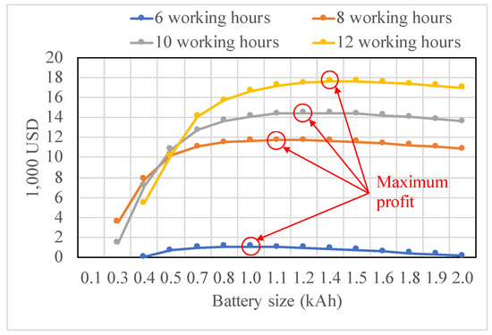 We can see that the optimal battery size differed with and expectedly decreased with shortened working hour windows. The optimal battery sizes maximizing the profit were 1.0 kAh, 1.1 kAh, 1.2 kAh, and 1.4 kAh when the working hours were 6, 8, 10, and 12, respectively. For example, 1.0 kAh was the optimal battery size for , significantly smaller than the 1.4 kAh of the 12 h case.
