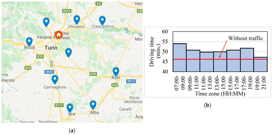 We used the Piedmont region in Italy as the delivery destinations. There are 10 destinations in Figure 9a including a depot. The depot marked as a red circle was assumed as a UPS delivery center in Torino. There were several route options connecting destinations to each other. Among them, the most recommended one by Google Maps was picked. We extracted the distance of each route and the related driving time. The practical distance of the route and driving time were different by direction. The driving time depended on the time of day. Therefore, we implemented one distance matrix and several driving time matrices by time slots. The average distance of the roads was 44 km, and the average time for driving the roads was 51 min.