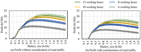 Figure 10 shows the overall profit of the delivery business by battery size in different working hours. Different colors mean different working hours. In each working hour, there is the optimal battery size maximizing overall profit. The maximum profits without consideration of traffic were 11 kUSD, 16 kUSD, 19 kUSD, and 21 kUSD, respectively. The graphs of the profit shift in the Y direction as we increase the working hours. However, the degree of the shift gradually decreases because the depreciation cost increases more steeply by working hour.