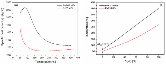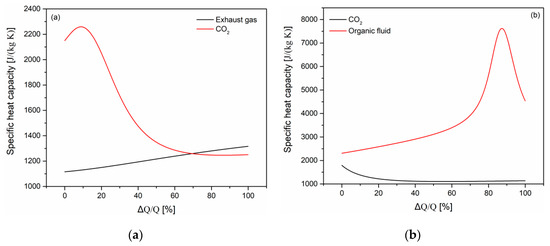 The exergy efficiency of CO2-TC+OTC is about 2% higher than that of CO2-TC/OTC. The distribution of the exergy loss in each component for the two combined cycles using pentane is shown in Figure 15. In CO2-TC+OTC, the recuperation process causes the largest exergy loss, which is due to the large difference in specific heat capacity of the hot and cold fluids in the recuperator (see Figure 1). Recompression can effectively reduce the exergy loss in the recuperator and the Tg,m will increase accordingly, which may lead to an increase of exergy loss in the organic HRVG. In CO2-TC/OTC, the largest exergy loss occurs in HRVG, followed by IHE. The specific heat capacity of CO2 and organic fluid in the heat addition process changes markedly (see Figure 16), resulting in the poor thermal match between exhaust gas and CO2 in HRVG and between CO2 and organic fluid in IHE.