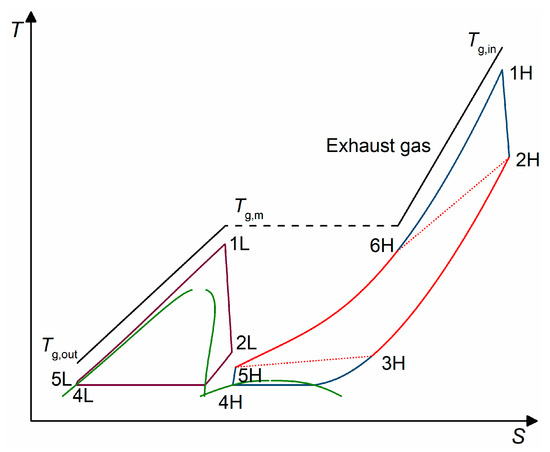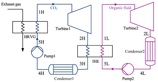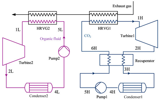 The schematic and T-s diagrams of the regenerative CO2-TC+OTC combined system are shown in Figure 2 and Figure 3. The exhaust gas releases heat to the CO2 and organic fluid in HRVG1 and HRVG2 (heat recovery vapor generator) successively. The generated high temperature CO2 and organic fluid expand in the turbine1 and turbine2 to do work (1H–2H, 1L–2L) respectively. The organic fluid exhausted from turbine2 flows into the condenser2 and releases heat to the cooling water (2L–4L). The saturated liquid leaving the condenser2 will be pressurized by the pump2 (4L–5L) and then enters the HRVG2 to absorb heat from the heat source (5L–1L). The exhaust CO2 from turbine1 enters the recuperator to preheat the low-temperature CO2 coming from the pump1 (2H–3H) and then liquefied by the cooling water in the condenser1 (3H–4H). The liquid CO2 exiting condenser1 is compressed by the pump1 (4H–5H) and heated in the recuperator (5H–6H) before flowing into the HRVG1 to absorb the waste heat (6H–1H).