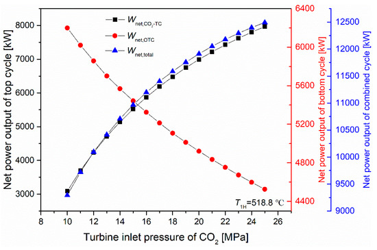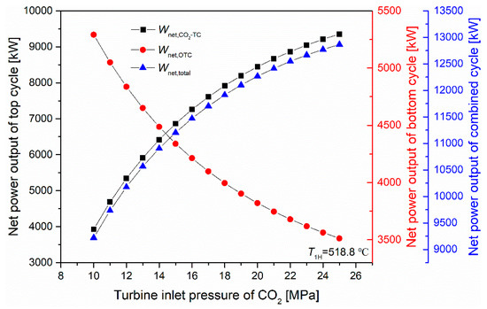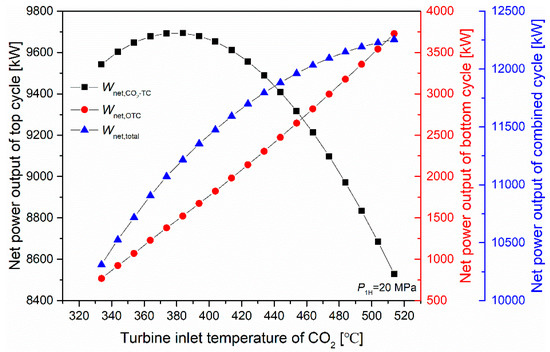 - As the turbine inlet temperature and pressure of CO2 increase, the total net power output of the combined cycle is increased, even though the net power output of the top or bottom cycle may decrease as a result.