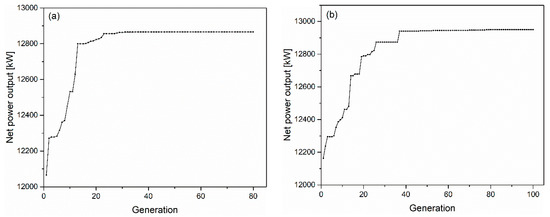 The decision variables of the combined cycle CO2-TC+OTC with R134a and pentane as the working fluid are optimized by using genetic algorithm. The variations of the net power output of the combined cycle with generation in the optimization process are shown in Figure 8. It can be seen that when the generation reaches about 50, the result tends to converge.