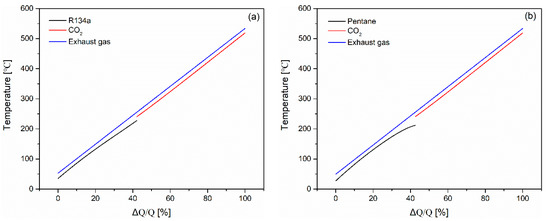 T-Q diagram of exhaust gas and working fluid for CO2-TC+OTC (a) R134a, (b) Pentane.
