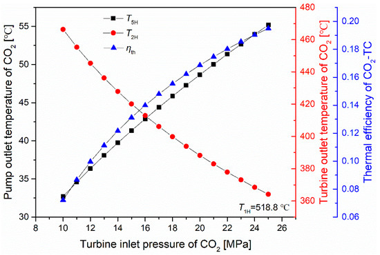 Variations of pump and turbine outlet temperatures and thermal efficiency with turbine inlet pressure of CO2 for CO2-TC.
