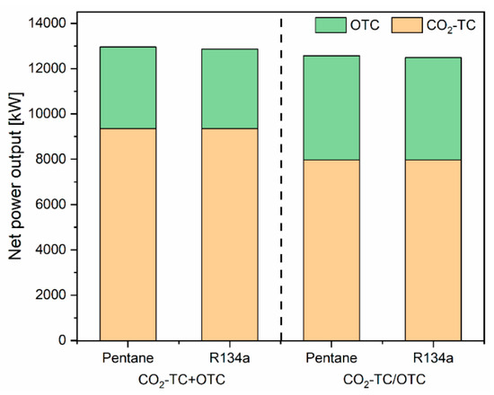 The optimized variables and the maximum net power output of combined cycle CO2-TC/OTC are listed in Table 5. Also, the optimal turbine inlet temperature and pressure of CO2 are their respective upper limits for CO2-TC/OTC. Figure 13 shows the comparison of the net power output of two combined cycles and it can be seen that the net power output of CO2-TC+OTC is slightly higher than that of CO2-TC/OTC. The net power output of OTC in CO2-TC/OTC is higher than that of the OTC in CO2-TC+OTC and the pentane still outperforms R134a since it can extract a little more heat from the exhausted CO2 with a lower thermal efficiency of the cycle, which have been revealed in the T-Q diagram of CO2 and organic fluid in the IHE shown in Figure 14.