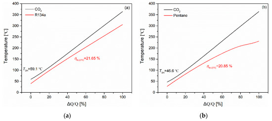T-Q diagram of CO2 and organic fluid (a) R134a, (b) Pentane in the intermediate heat exchanger (IHE) of CO2-TC/OTC.