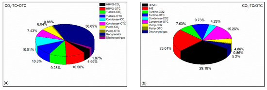 Distribution of exergy loss in each component of the combined cycle (a) CO2-TC+OTC; (b) CO2-TC/OTC.