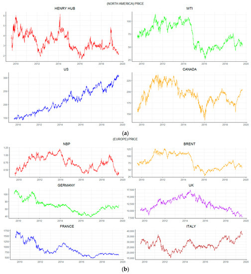 For the North American market, we use the daily prices of the Henry Hub Natural Gas Futures from Bloomberg for the natural gas market. For the crude oil market, we employ the Crude Oil WTI Futures from Bloomberg. With exports grown in Europe, South America, and Asia, the New York Mercantile Exchange (NYMEX) Henry Hub Natural Gas futures have become a global price benchmark for natural gas trading. WTI, a medium crude oil and futures contract launched by the NYMEX in 1983, has long been a benchmark for international crude oil prices, thus making an important contribution to the development of the global crude oil market. For the stock market, we use the electricity utilities in the US and Canada. For the US, we use the Standard and Poors 500 Utilities (S&P 500) which is composed of electricity and energy companies included in the S&P 500. This is classified as members of the Global Industry Classification Standard (GICS) utilities sector, such as the American Electric Power Company (AEP), Duke Energy Company (DU), Consolidated Edison Company (ED), and 28 other companies in total. The S&P/TSX Capped Utilities Sector Index (TSX) is a market-value-weighted index obtained from 16 electricity and energy companies, such as Emera Inc. (EMA) and Fortis Inc. (FTS).