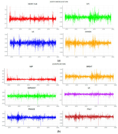 (a) Time-variations of the return series in North America. Notes: Henry Hub indicates natural gas; WTI indicates crude oil; US indicates the S&P 500 Utilities Index; CANADA indicates the S&P/TSX Capped Utilities Sector Index. (b) Time-variations of return series in Europe. Notes: NBP indicates natural gas; BRENT indicates crude oil; GERMANY indicates the DAX subsector for all electricity; UK indicates the FTSE 350 Electricity Index; FRANCE indicates the CAC Utilities Index; ITALY indicates FTSE Italia All-Share Utilities Index.