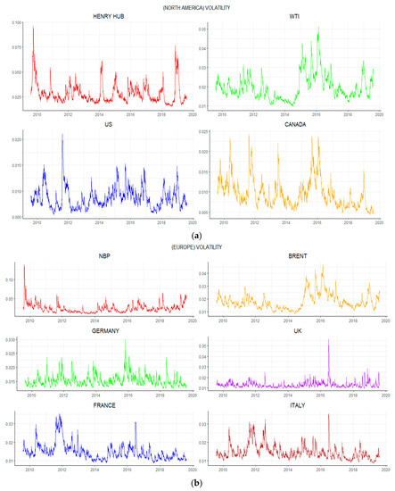 (a) Time-variations of the volatility series in North America. Notes: Henry Hub indicates natural gas; WTI indicates crude oil; US indicates the S&P 500 Utilities Index; CANADA indicates the S&P/TSX Capped Utilities Sector Index. (b) Time-variations of volatility series in Europe. Notes: NBP indicates natural gas; BRENT indicates crude oil; GERMANY indicates the DAX subsector for all electricity; UK indicates the FTSE 350 Electricity Index; FRANCE indicates the CAC Utilities Index; ITALY indicates FTSE Italia All-Share Utilities Index.