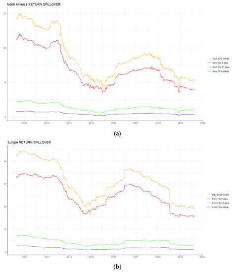 As displayed in Figure 4a,b, we find some characteristics from the dynamics of the total return spillover and the frequency decomposition of North America and Europe. In both North America and Europe, the total return spillover occurs in the short-term. Moreover, two dynamic return spillover figures have a similar trend. In Europe, the total spillover of the DY12 model for the return series varies between 20% and 45%, which is wider than that in North America (between 10% and 30%). From 2009 to mid–2013, whether in North America or Europe, the total return spillover retains high stability, which may be a consequence of the effect of the 2008 global financial crisis or the 2010 European sovereign debt crisis. The total return spillover in both North America and Europe began to increase steadily until around 2017, which could be influenced by the 2014 international crude oil crisis.