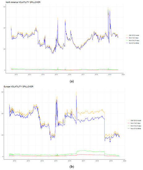 We followed Diebold and Yilmaz [1] (hence, DY12) to obtain the spillover effects in the time domain. We first estimated the four variables in our VAR model in the North American market and the six variables in our VAR model in the European market. Then, we used the generalized variance decomposition for a forecast error to set up the spillover table to measure the direction and intensity of spillover across the selected markets.
