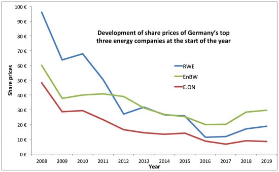 These four companies, the result of several mergers since the liberalization of the electricity market, had a long history and a traditional generation portfolio based mainly on fossil fuels and nuclear energy. Furthermore, two of the companies (RWE and Vattenfall) relied heavily on lignite, the most CO2-intensive fossil fuel. In a nutshell, the business models of Germany’s Big 4 were traditionally based on non-renewables. On account of their power plant portfolio and in the face of climate change concerns, the approach taken by the Big 4 to even out their carbon account relied heavily on nuclear energy and on improving the efficiency rate of existing power plants, combined with a limited investment in renewable energies. Furthermore, they advocated carbon capture and storage (CCS) via EURELECTRIC, the association representing the interests of the electricity industry in Europe []. These strategic decisions turned out to be insufficient. The notion of business models for the energy industry dates back to the mid-20th century [], but has grown significantly in importance since the liberalization of the energy industry [].