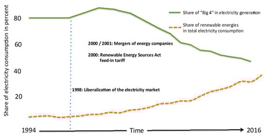 The increasing share of electricity generation from renewable energy and the declining market share of the “Big 4” since the liberalization of the market. Source: Agency for Renewable Energies (German: Agentur für Erneuerbare Energien) [].