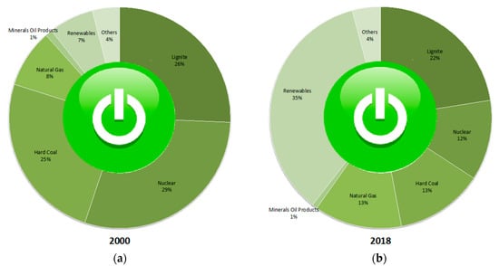 Comparison of electricity generation in Germany by energy source in (a) 2000 and (b) 2018 Source: BDEW Federal Association of Energy and Water Management, Working Group on Energy Balances (German: Arbeitsgemeinschaft Energiebilanzen), Federal Ministry for Economic Affairs and Energy, Center for Solar Energy and Hydrogen Research, and coal industry statistics. Source: Statista ID: 156695, statista.com.