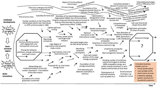 We suggest that an analysis using the overview approach provided by the MLP may provide valuable insights to our understanding of how changes in the energy landscape have affected the German regime of electricity companies. However, as “an abstract analytical framework that identifies relations between general theoretical principles and mechanisms,” [] it cannot be used to study specific details of the processes and interactions that occur during the transition. Complementary theories are therefore needed to operationalize the MLP []. MLP analysis is fed and substantiated by the results of a previous study on the rise and fall of electricity companies, which made use of triangulation (involving expert interviews, participatory observations at two official company events (annual general meetings), and interviews with representatives from the four companies).