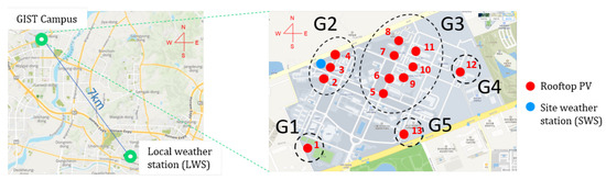 In this study, actual PV fleet data were utilized for analysis and simulation. Hourly power generation data were measured in rooftop solar installations from 13 buildings at the Gwangju Institute of Science and Technology (GIST) campus located in Gwangju, South Korea, as shown in Figure 1, with installation details given in Table 1. In this densely distributed PV fleet, only the facility management building (site 3) collects environmental information, such as ambient temperature, module temperature, slope solar irradiance, and horizontal solar irradiance. The data were collected in 2019 for approximately nine months. To investigate the influence of solar irradiance with respect to the distance between the weather station and PV installation, local environmental data retrieved from the nearest weather station provided by the Korea Meteorological Administration (KMA) website were used [47]. The weather data including local solar irradiance were recorded every hour, the same as for the PV data. We selected 159 days of PV power data from 13 sites without missing values for an overlapping period. The meteorological data were acquired at the site weather station (SWS). In addition, a local weather station (LWS), which was approximately 7 km away from the campus, was subsequently employed for the same time period.