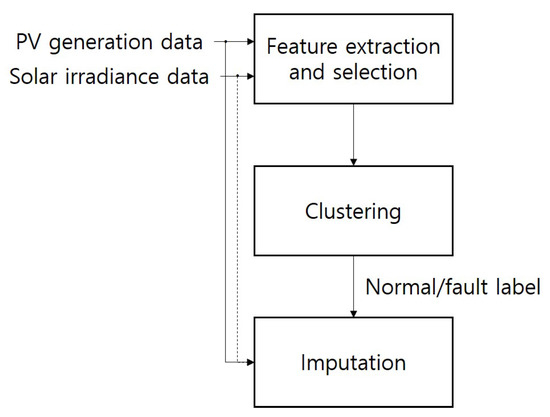 A photovoltaic (PV) power plant is one of the most renewable, sustainable, and eco-friendly setups for converting solar energy, which is the most abundant and freely available energy source, into electrical energy [1]. The contribution of solar energy to the total global energy supply has rapidly increased in recent decades with PV installation capacity growing to more than 500 GW by the end of 2018 [2,3]. However, PV systems are exposed to harsh working conditions owing to uncertain outdoor environments and their complex structure. In [4], it was reported that the annual losses in PV generation reached 18.9% under zero or shading faults. Improving the reliability of renewable energy generation by fault detection and diagnosis (FDD) and correcting faulty data is essential for maintaining the efficiency of PV generation [5]. In addition, reliable information is required to be applied for various power applications, e.g., energy scheduling [6] and energy forecasting [7,8], to guarantee safe and stable grid systems.