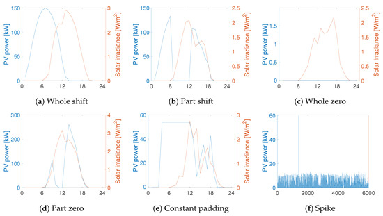 To evaluate the performance, we primarily sorted 159 days of PV generation patterns for all sites for the normal condition simultaneously. The overall normal dataset comprised PV power profiles. To characterize the fault patterns, the actual fault patterns detected from different PV plants were investigated. Six fault patterns were extracted, which were composed of whole zero, part zero, whole shift, part shift, constant padding, and spike, as shown in Figure 4. The faults were injected arbitrarily into a single or multiple power profiles of PV sites, thus retaining target labels to describe the performances of fault detection and imputation.