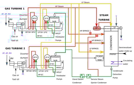 This type of CCPP is being installed in an increasing number of plants around the world, where there is access to substantial quantities of natural gas []. As it was reported in [], the proposed CCPP is designed with a nominal generating capacity of 480 megawatts, made up of megawatts ABB GTs, dual pressure Heat Recovery Steam Generators and megawatts ABB ST. GT load is sensitive to the ambient conditions; mainly ambient temperature (AT), atmospheric pressure (AP), and relative humidity (RH). However, ST load is sensitive to the exhaust steam pressure (or vacuum, V). These parameters of both GTs and STs are used as input variables, and the electrical power generating by both GTs and STs is used as a target variable in the dataset of this study. All of them are described in Table 1 and correspond to average hourly data received from the measurement points by the sensors denoted in Figure 1.