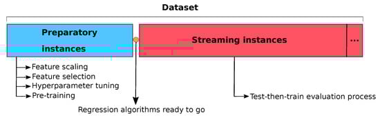 When designing SL algorithms, we have to take several algorithmic and statistical considerations into account. For example, we have to face the fact that, as we cannot store all the inputs, we cannot unwind a decision made on past data. In batch learning processing we have free access to all historical data gathered during the process, and then we can apply “preparatory techniques” such as pre-processing, variable selection or statistical analysis to the dataset, among others (see Figure 2). Yet the problem with stream processing is that there is no access to the whole past dataset, and we have to opt for one of the following strategies. The first one is to carry out the preparatory techniques every time a new batch of instances or one instance is received, which increments the computational cost and time processing; it may occur that the process flow cannot be stopped to carry out this preparatory process because new instances continue arriving, which can be a challenging task. The second one is to store a first group of instances (preparatory instances) and carry out those preparatory techniques and data stream analysis, applying the conclusions to the incoming instances. This latter case is very common when streaming is applied to a real environment and it has been adopted by this work. We will show later how the selection of the size of this first group of instances (it might depend on the available memory or the time we can take to collect or process these data) can be crucial to achieve a competitive performance in the rest of the stream.