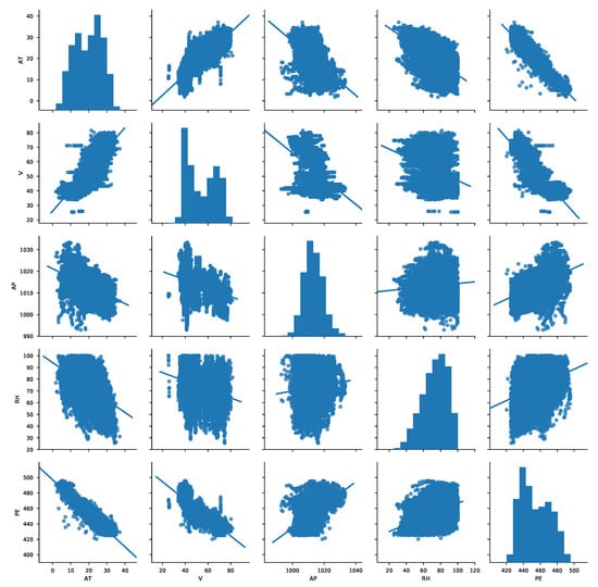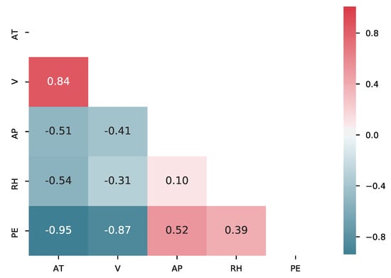 The input variables (AT, V, AP, RH) affect differently the target variable (PE). Figure 6 shows the correlation between the input and the target variables. On the one hand, we observe how an increase in AT produces a decrease in PE, with a minimal vertical spread of scatter points which indicate a strong inverse relationship between them. This conclusion is supported by a correlation value of in Figure 7. In fact, there are some studies about GTs [,,] which show the effect of AT on the performance of CCPPs. The performance reduction due to an increase in temperature is known to stem from the decrease in the density of inlet air.