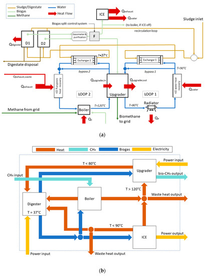 As a reference case study, an anaerobic digestion plant that processes the sludge from a municipality waste-water treatment plant was considered [32,33]. The system is made up of two anaerobic digesters, a biogas/methane fueled boiler, an internal combustion engine (ICE) and a biogas upgrading system. The plant scheme is shown in Figure 1a. The heat management is performed by means of two heat exchange sections named Loop 1 and Loop 2, which are thermally connected through the upgrader. The mass and energy streams between the components are highlighted in different colors in Figure 1b. Two digesters (D1 and D2) of 3000 m3 and 1300 m3 co-digest sewage and bio-wastes and produce 235 Nm3/h of biogas with about 65%vol methane concentration. Sludge recirculation with a 1:23 mass flow ratio value is thought to prevent the achievement of high temperatures during sludge heating. This means that the sludge mass flow circulating in the heat exchangers is much greater than the actual sludge mass flow treated by the plant.