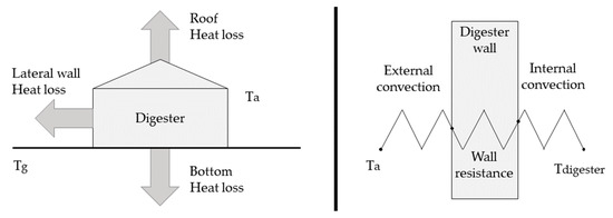The thermal loss from the digesters was estimated by considering the heat transfer convection from the lateral wall, roof and ground, according to the equivalent electric scheme reported in Figure 3 (Equation (2)).
