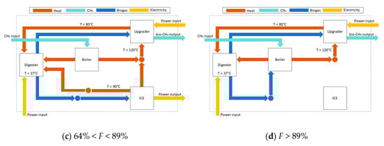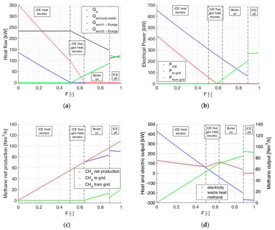 The results of the simulations are presented in Figure 4a–d as a function of F. In more detail, Figure 4a is focused on the thermal energy fluxes through HE-01 and HE-02 or wasted through the radiator or the Qexhaust bypass (see Figure 1a). Figure 4b shows the electric power source and users, Figure 5c shows the methane production and Figure 4d the net system outputs. Figure 5 also reports the main events driving the system behavior, which are deduced from the scheme presented in Figure 1b, the constraints showed in Table 2, and the related cogeneration unit and boiler activities. Therefore, four operation patterns were detected according to the F range (Figure 4).