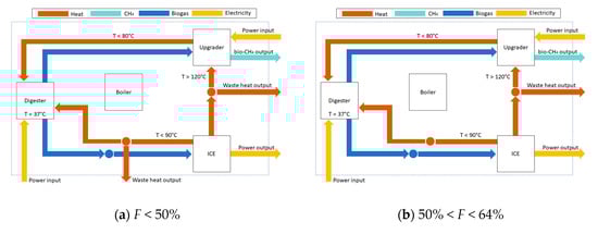 In the study, the value of F was varied, and the different operating conditions of the plant were investigated. The size of the cogeneration unit was changed according to the value of F up to a minimum value. After this value, a no-cogeneration condition was considered, and the thermal energy was assumed to be produced by the boiler and the necessary electric energy bought from the electric grid. In addition, as the heat recovered from the ICE is dependent on its size, when F assumes high values, the boiler must provide the necessary heat to the digesters and the upgrader. To investigate the net outputs of the system, the value of F was varied between 0% and 100%. For each value of F, the cogeneration unit size and energy output were determined. As the heat request from the upgrading system is known (and depending on F), both the thermal loop insisting on the upgrading system and the amount of heat transferred to the sludge in HE-01 and HE-02 may be calculated by considering the constraints regarding maximum and minimum temperatures in Loop 1 and 2. Finally, if the thermal energy requested is more than that recovered in the previous stages, the boiler independently provides the remaining heat to the sludge or to the upgrading system.