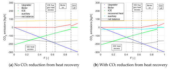 Biomethane production leads to a negative CO2 emission profile for all the working conditions considered. As expected, the main reduction comes from the biomethane production due to biogas upgrading, and the ICE operation. In both cases, the minimum carbon dioxide net emissions are obtained when F = 64%. This condition occurs when the plant is near self-sustaining conditions from an electrical point of view (Figure 5) and only a small amount of electricity is bought from the grid to drive auxiliary and upgrading systems. From the thermal point of view, the cogenerator unit is sufficient to satisfy the thermal requirements of the plant. Therefore, in this operating condition the boiler is not necessary.
