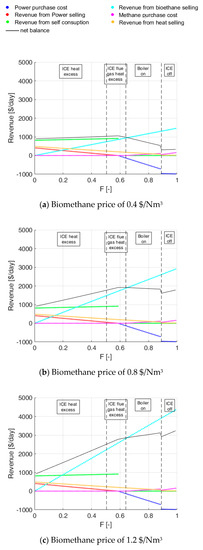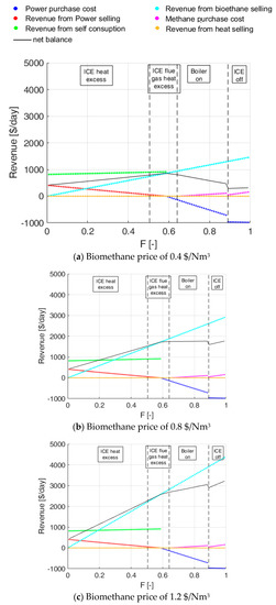 The analysis was further extended to investigate the operative conditions that maximize the economic gain of the plant. In this analysis, the costs of acquired electricity and natural gas were assumed as 0.15 $/kWh and 0.24 $/Nm3, respectively, as these are typical in the Italian context [40]. The revenues derived from the self-consumed electric energy were estimated by multiplying the daily production for the same acquiring price of 0.15 $/kWh (avoided cost). The revenues from electric energy production were quantified by considering a selling tariff of 0.04 $/kWh. Finally, the biomethane production was accounted for by considering three different selling prices since governmental subsides are largely dependent on the digesters’ supply. Therefore, three final selling prices considering subsides (0.4, 0.8 and 1.2 $/Nm3) were considered for this purpose. For a tariff of 0.4 $/Nm3, the revenues and costs are reported in Figure 7a, together with the net gain. The revenues from selling the biomethane are represented by a straight line, which naturally grows with F. The revenues from selling the electric energy are maximum for low values of F, when electricity production is the highest contributor. These revenues decrease linearly with F until the electric production is larger than the sum of the plant and the upgrading system request (internal request). The revenues from the self-consumption of the electric energy are almost constant with F and start to decrease when the ICE power output is lower than the internal request. This contribution became zero when the engine is shut down at F = 89%. As expected, the cost of acquired electric energy (represented as a negative value) is zero if the ICE production is higher than the internal request. After that point it increases and becomes constant when ICE is shut down. The cost of acquired natural gas is zero when the boiler is off and begins to grow when the cogeneration unit does not provide enough thermal energy (F > 64%).
