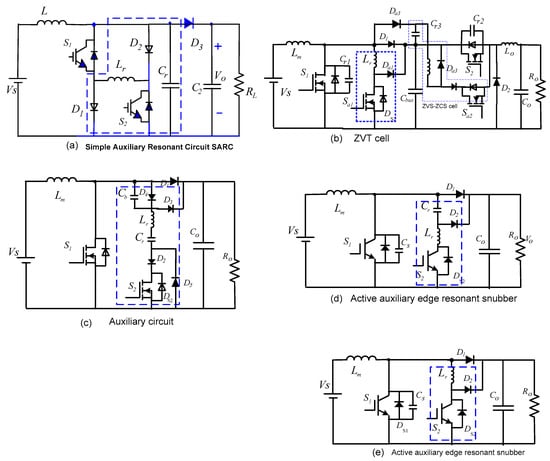 Figure 1d shows the configuration circuit of boost type based on an edge-resonance ZVS-PWM DC-DC converter circuit utilizing IGBTs as active switches [15]. This converter is considered a conventional chopper-fed, boost-type power converter circuit. This converter also includes an auxiliary active resonance-snubber circuit, which includes a resonance capacitor Cr, a resonant inductor Lr, an auxiliary active power switch S2, a lossless snubber capacitor Cs, and diode D2 in the auxiliary circuit.