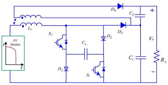 Recently, vigorous attempts have been made to attain optimized switch-mode power converter circuits with which to interface renewable energy sources to a utility such as a solar photovoltaic PV, fuel cell, and supercapacitor banks. To increase the dependence of the power electronics system and the power conversion capability, the expansion of boost DC-DC circuits is needed with modern control schemes [1,2,3,4,5]. Solar photovoltaics have been introduced as a future power source, due to the increasing need for clean energies and power-distributed generation systems. Injecting the generated energy into the network (grid) requires power conditioning circuits. In general, a higher step-up ratio DC-DC circuit is required for boosting the low PV voltage to a higher voltage output. Using conventional circuits such as cascade DC-DC power converters leads to additional cost and system complexity. Moreover, the conventional fly-back DC-DC converter topologies have leakage constituents that lead to voltage stresses on the semiconductor switches and more power losses, resulting in lower circuit efficiency.