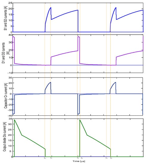 The current through coupled inductor iLr is equally divided into two branches, S1–D2 and S2–D1. From Equation (7), iLr at time t2 can be calculated by