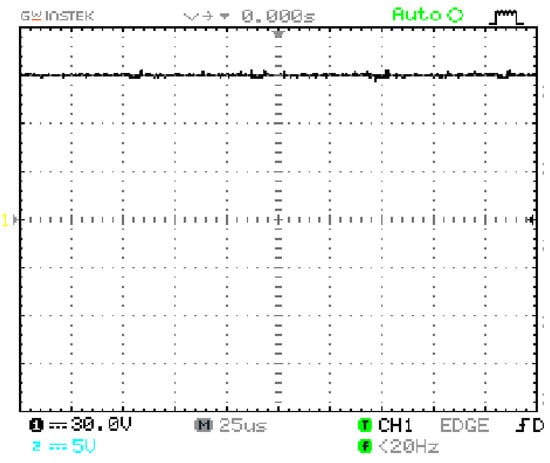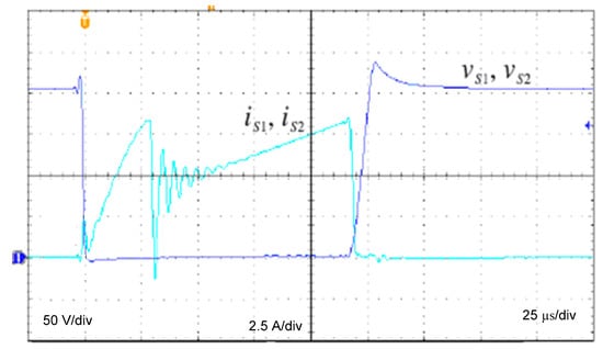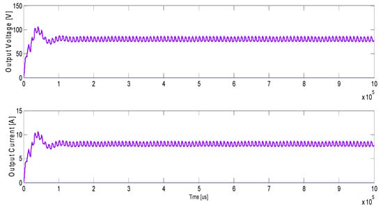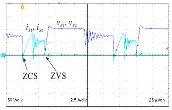 Figure 8 and Figure 9 show the waveforms of output voltage and current of two switches under different loading conditions. As shown, both the switches can turn on and turn off with zero-current soft switching. Subsequently, a reduction in the switching losses can be obtained, and an improvement in the efficiency of the converter can be achieved. Figure 10 shows the output voltage waveform at standard irradiance, i.e., 1000 W/m2, and full-load condition.