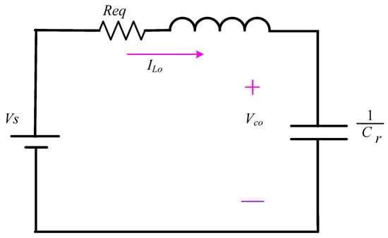 The resonance capacitor Cr has been discharged in this interval by the edge-resonant current flow in the ER-SC circuit, as shown in Figure 3. During this interval, the equivalent circuit during resonance operation can be simplified, as shown in Figure 6. Req is the equivalent series resistance of the circuit; it is a simple RC circuit. The resonant inductor current and resonant capacitor voltage can be obtained using the Laplace transform.
