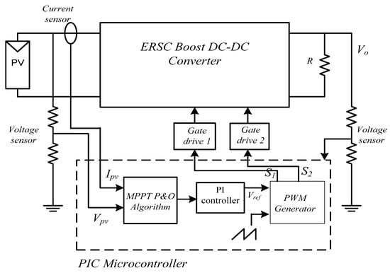 Figure 7 shows a block diagram of the control system. The implemented converter is controlled by the PIC microcontroller, which is used to develop the P&O MPPT algorithm. In this case, the outmost feedback loops have to be connected to the output terminal of the associated power electronic converters, and hence, the input terminal will behave as a negative incremental resistor at low frequencies [37]. This property will limit the operation of the PV interfacing converter in either the constant voltage or the constant current region of the PV generator to ensure stable operation. The boost DC-DC converter can be applied as a voltage- or current-fed converter, limiting the stable operation region accordingly [37].