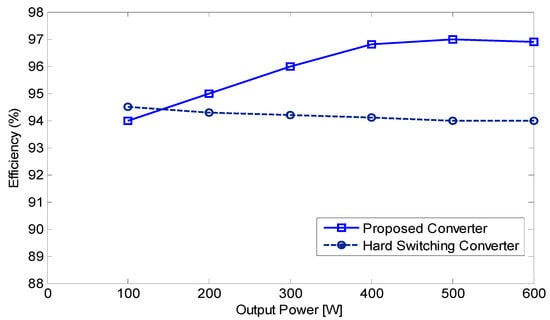 Figure 11 shows the measured efficiency of the proposed boost DC-DC converter. The developed circuit has better efficiency than the previously-developed [6] hard-switching converter. However, the maximum obtained efficiency is 97.1% at full load, i.e., 500 W; about a 3% improvement in efficiency is gained. The switching losses are about 5 W at a switching frequency 40 kHz. A photograph of the experimental setup hardware is shown in Figure 12. The PV array installation on the roof is shown in Figure 13.