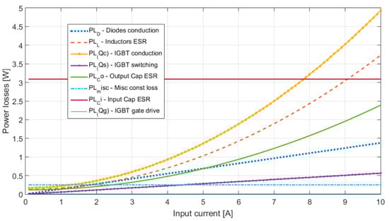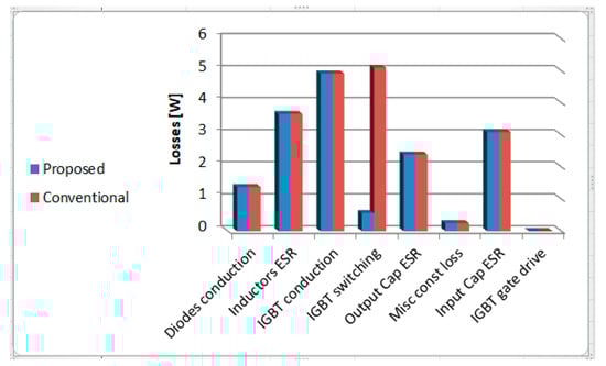 The section presents a comparative analysis of previously-developed hard-switched and the proposed soft-switched converters. Analytical calculations are made to calculate the losses of components, voltage, power, and frequency of switching, and the increase in temperature due to the use of semiconductors devices. Figure 14 shows the power losses as a function of the input current. The compared power converters are realized and investigated experimentally. Figure 15 is used to analyze the dissipated losses in the two converters and each of their passive and active components. The power loss breakdown of the key components of the implemented converter is estimated. Figure 16 shows the losses breakdown (calculated value) at half- and full-loading condition of the proposed circuit.