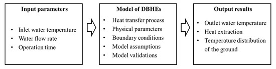 In order to examine the key factors of the heat transfer performance as well as analyze the feasibility and stability of DBHEs under long-term operation, a numerical simulation is developed. As shown in Figure 3, the model consists of model assumptions, mathematical equations of heat transfer process, physical parameters, boundary conditions and model validations. The Input parameters are the inlet water temperature, water flow rate and the operation time while the output results are outlet water temperature, total heat extraction and temperature distribution.