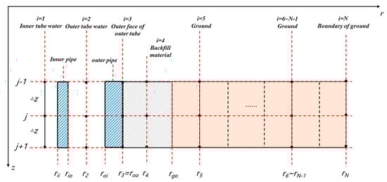 As shown in Figure 2, the heat transfer process can be described as a two-dimensional cylindrical coordinate transient heat transfer process, including the heat convection between inner pipe fluid and outer pipe fluid, the heat convection between outer pipe fluid and outer pipe, the heat conduction in the outer pipe wall, the backfill material and the ground. The following assumptions are made to develop the heat transfer model.