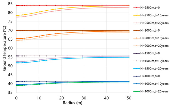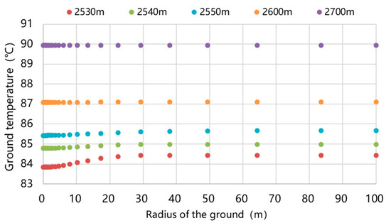 - To confirm the specific depth of the bottom boundary and radius of the radial far boundary, a simulation of 10-years operation is conducted. In the simulation, the depth of the bottom boundary is set as 3000 m and the radius of the radial far boundary is set as 100 m. Figure 5 depicts the ground temperature distribution at the depth of 2530–2700 m. It shows that the ground temperature remains the same along the radial direction at the depth of 2700 m. Therefore, the depth of bottom boundary is then re-set at 2700 m.